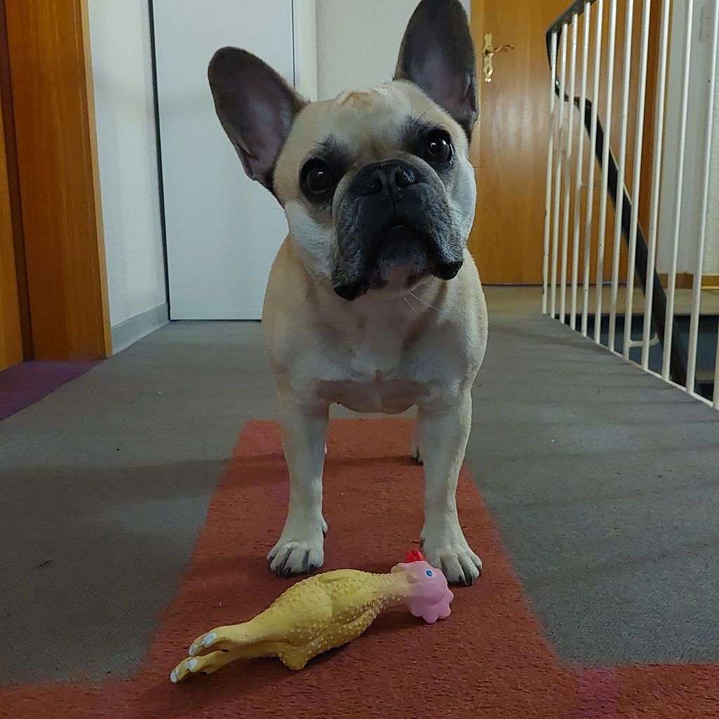 Nach der Gassirunde will Lotte immer spielen. Das Huhn ist ihr Liebling, noch viel lieber würde sie mit den echten Hühnern „spielen“.