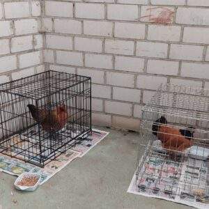 Beim Entglucken hilft Kälte, Helligkeit und Stören, denn Glucken haben es gerne warm, dunkel und ruhig. Wir haben Hilde kalt gebadet und alleine gesetzt. Frühmorgens und zwischendurch hat sie ordentlich Krach gemacht. Krählaute, versetzt mit einzelnen lauten Schreien, wie wenn sie das Zeitliche segnen würde. Dabei hat sich Hilde wohl eine kleine Tonsur zugelegt und am Kopf Federn gelassen. Ich vermute, sie hat versucht auszubrechen. Dieser Käfig ist eigentlich für Hunde, und hat schon ein paar Kanten. Als wir dann Änne, ebenfalls zum Endglucken, in einen zweiten Käfig setzten, war dann erstmal Ruhe. Tagsüber habe ich einen Käfig auf die Wiese gestellt.