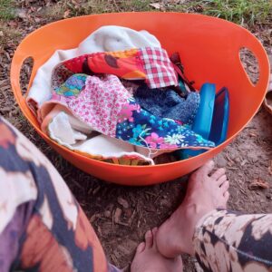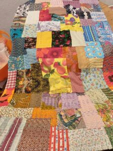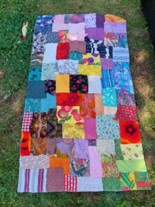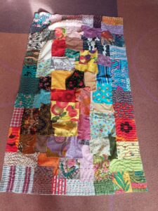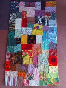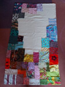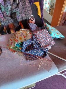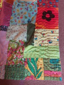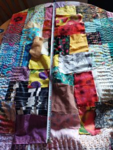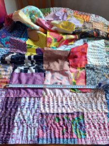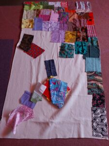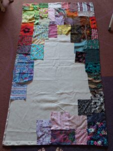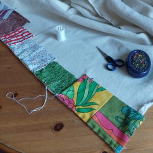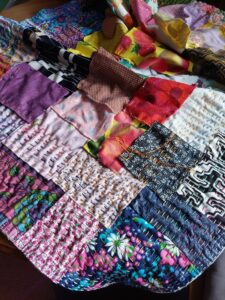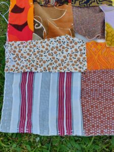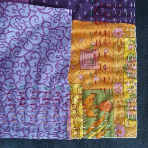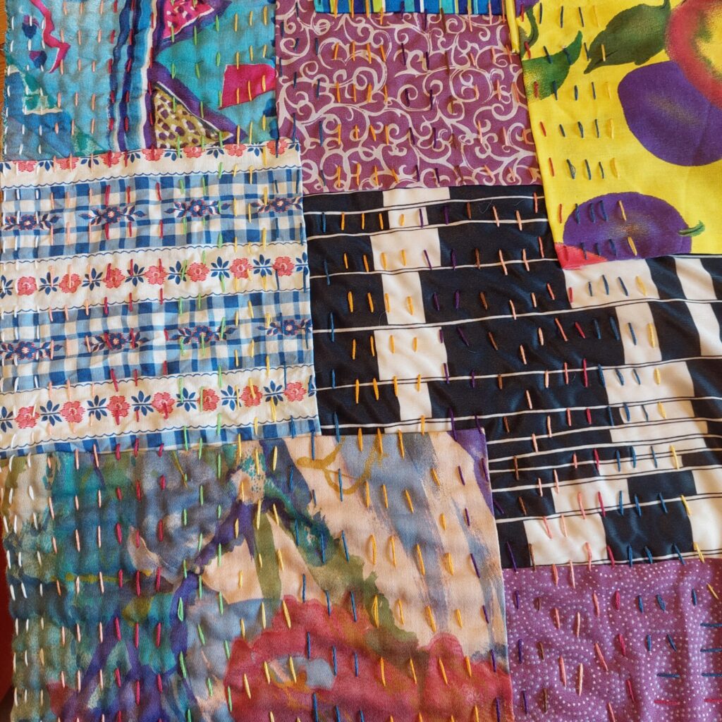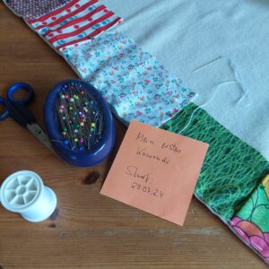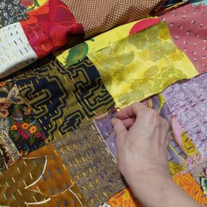 Beim Nähen am Kawandi spüre ich die Vielfalt der Stoffe: mal rau, mal glatt, mal weich. Achtsam führe ich die Nadel durch die Schichten, achte auf die Nadeln, die alles zusammenhalten, und passe auf, mich nicht zu stechen – ganz gegenwärtig.