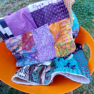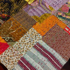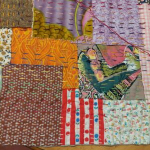 Kawandi ist eine traditionelle indische Quilttechnik, die von den Siddi, einer ethnischen Gemeinschaft mit afrikanischen Wurzeln in Indien, praktiziert wird. Genäht wird meist mit recycelten Stoffen – improvisiert, kreativ und von Hand. Es ist eine meditative Technik, bei der die Stoffstücke von außen nach innen in Runden aufgenäht werden.