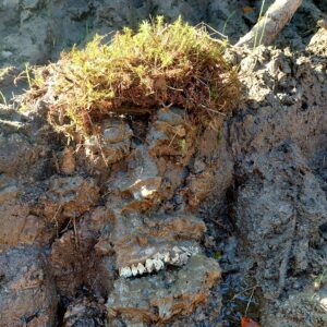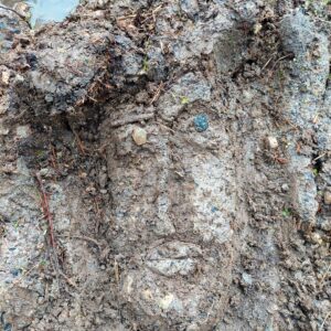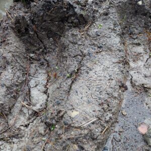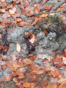Der Waldboden selbst ist weich und lebendig – bedeckt von Laub, Moos und Nadeln, durchzogen von Wurzeln und Mikroorganismen, die Nährstoffe zersetzen und den Boden belüften. Zum Modellieren eignet er sich allerdings kaum: Zu locker, zu krümelig, zu wenig Halt. Erst durch den Eingriff der Maschinen entsteht eine kompakte, feuchte Masse – ähnlich wie Tonklumpen – die sich formen, drücken, ritzen lässt.