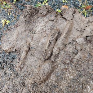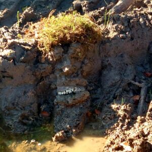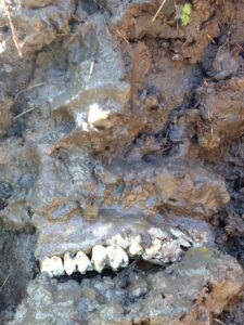 Dann dieser Haufen – fester Matsch, dunkel, glänzend, schwer. Irgendetwas in mir dachte: Das lässt sich doch modellieren. Und gleichzeitig – Ekel. Die Erde war feucht, roh, fast körperlich. Ich holte die Gummihandschuhe aus dem Hunderucksack. Nur mit Barriere konnte ich mich annähern.