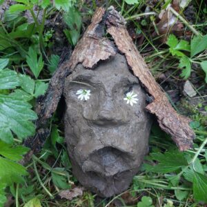 Ein kleiner, beweglicher Kopf – der erste seiner Art. Mit O-Mund, flacher Nase und Gänseblümchen in den Augenhöhlen erinnerte er mich an einen Schrumpfkopf. Die Haare bestanden aus Rindenstücken. Ich setzte ihn in einen Holzstapel, wo er für einige Tage verweilte – gut sichtbar, fast wie ausgestellt.