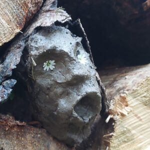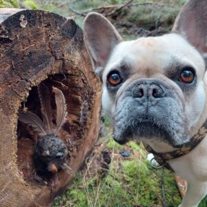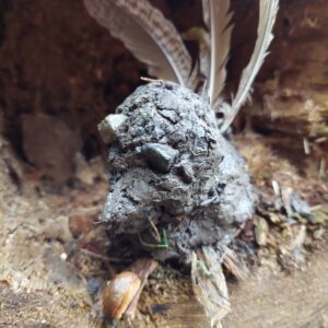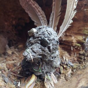 Sie entstand ganz aus Walderde – feucht, formbar, geheimnisvoll. Zwei tiefe Augen, der angedeutete Schnabel, ein kompakter Körper: In wenigen Handgriffen war sie da, als wäre sie schon immer im Stamm verborgen gewesen. Der Baumstumpf wurde ihr Podest, das gebogene Aststück im Hintergrund rahmte sie wie ein aufgestellter Flügel.