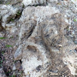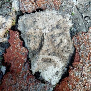 Ein Kopf im Relief, mit Bart – vielleicht das Weiße des Waldes selbst. Geformt aus recht trockenem Boden, mühsam modelliert. Zur besseren Sichtbarkeit habe ich ihn mit rötlichen Rindenstücken eingefasst.
