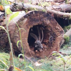 Wunderbar geborgen sitzt er in der runden Öffnung eines liegenden, hohlen Baumstamms – wie in einer kleinen Höhle.