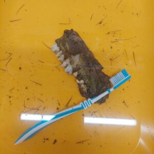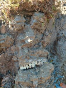 Das Lächeln verdankte er einem kuriosen Fund: einem echten Tiergebiss, das ich irgendwann im Wald entdeckt und gesammelt hatte. Ich setzte es dem Kopf ein – und plötzlich grinste er mich an.