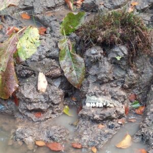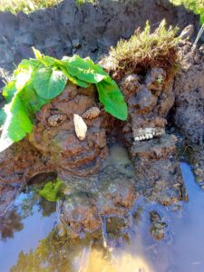 Ein flach liegender Körper, ein wuchtiger Kopf, angedeutete Krallen – über mehrere Tage hinweg stieg er langsam aus dem Wasser aufs Land. Anfangs nur ein formloser Klumpen, formbar und weich. Dann: modelliert, verfeinert, gehärtet. Ich kam immer wieder zurück, arbeitete weiter – bis sich das Wesen zeigte – und wieder verschwand.