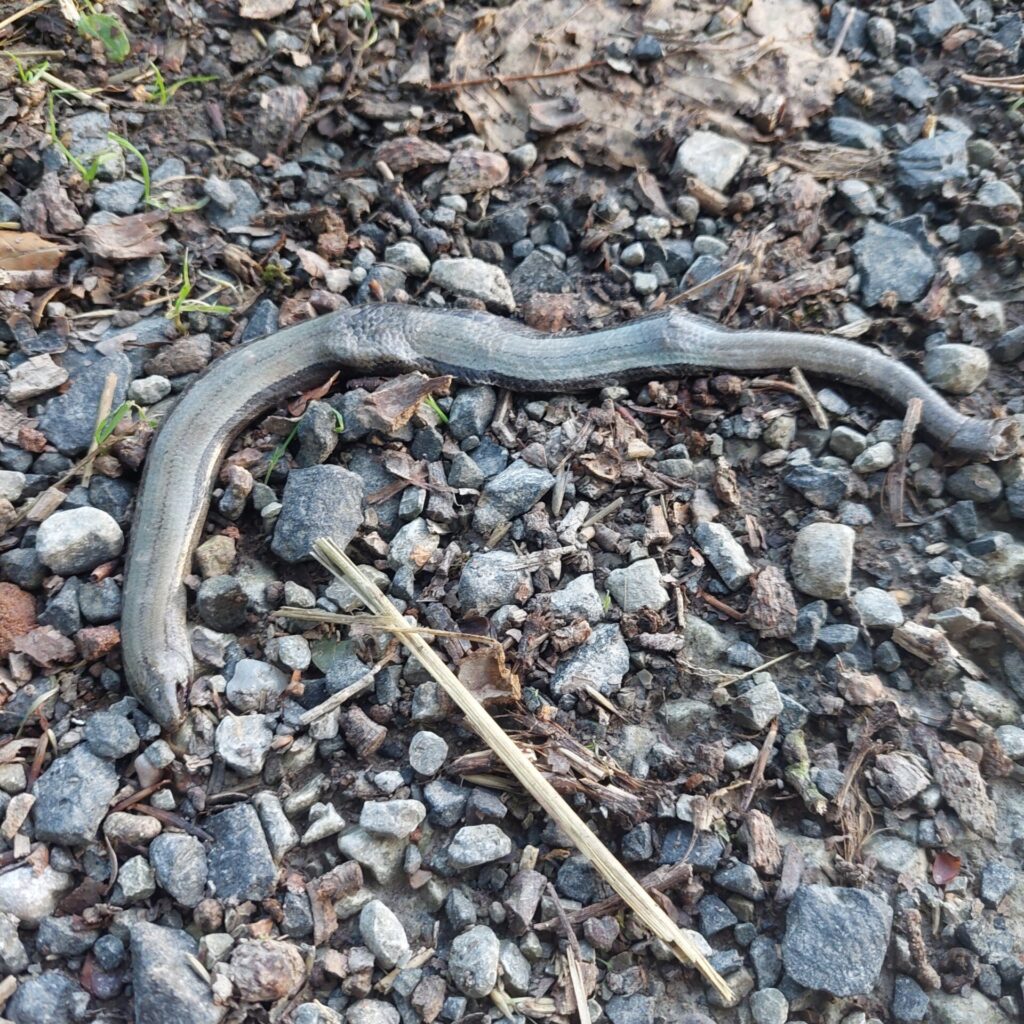 Eine Blindschleiche, leblos, leicht verdreht, auf grobem Kies.